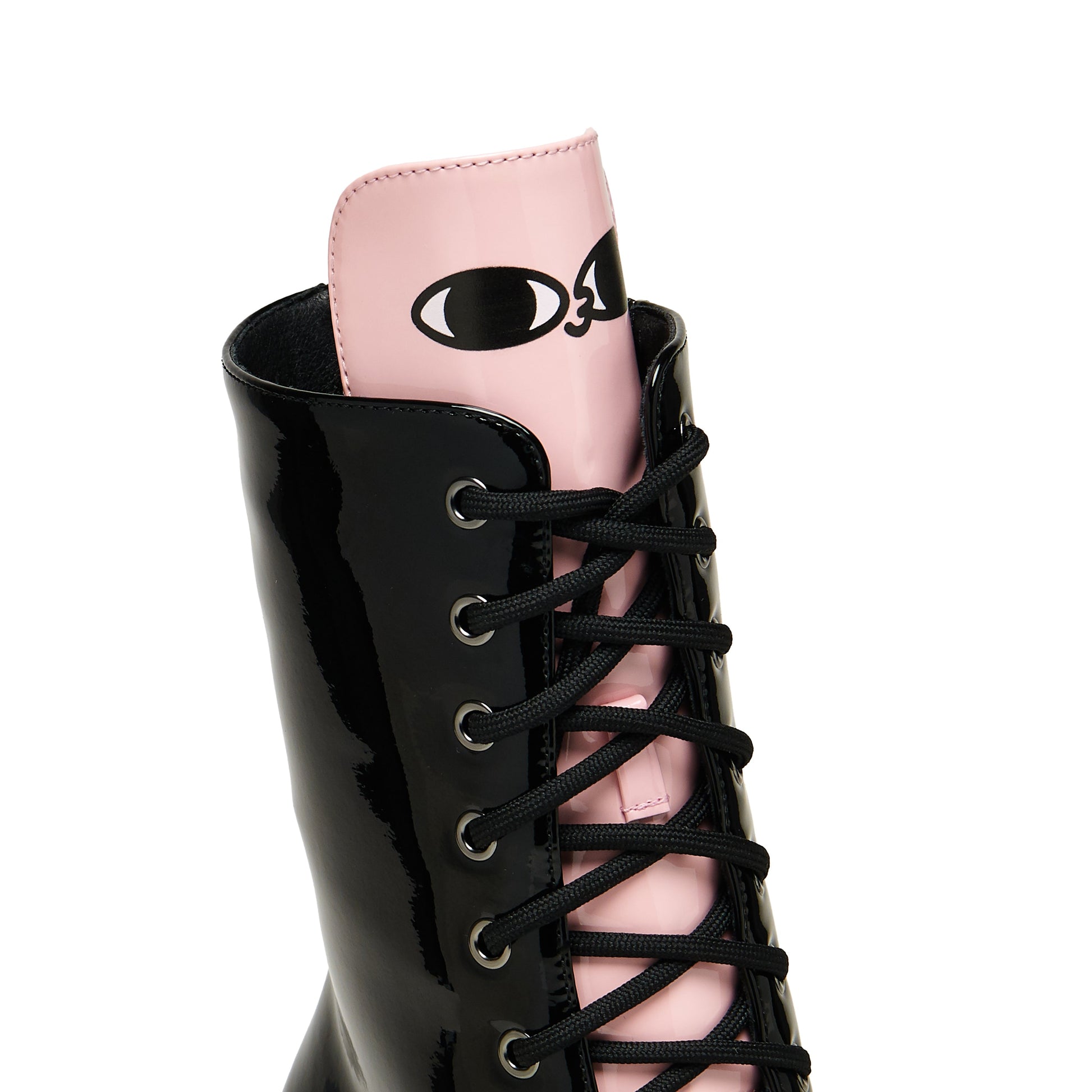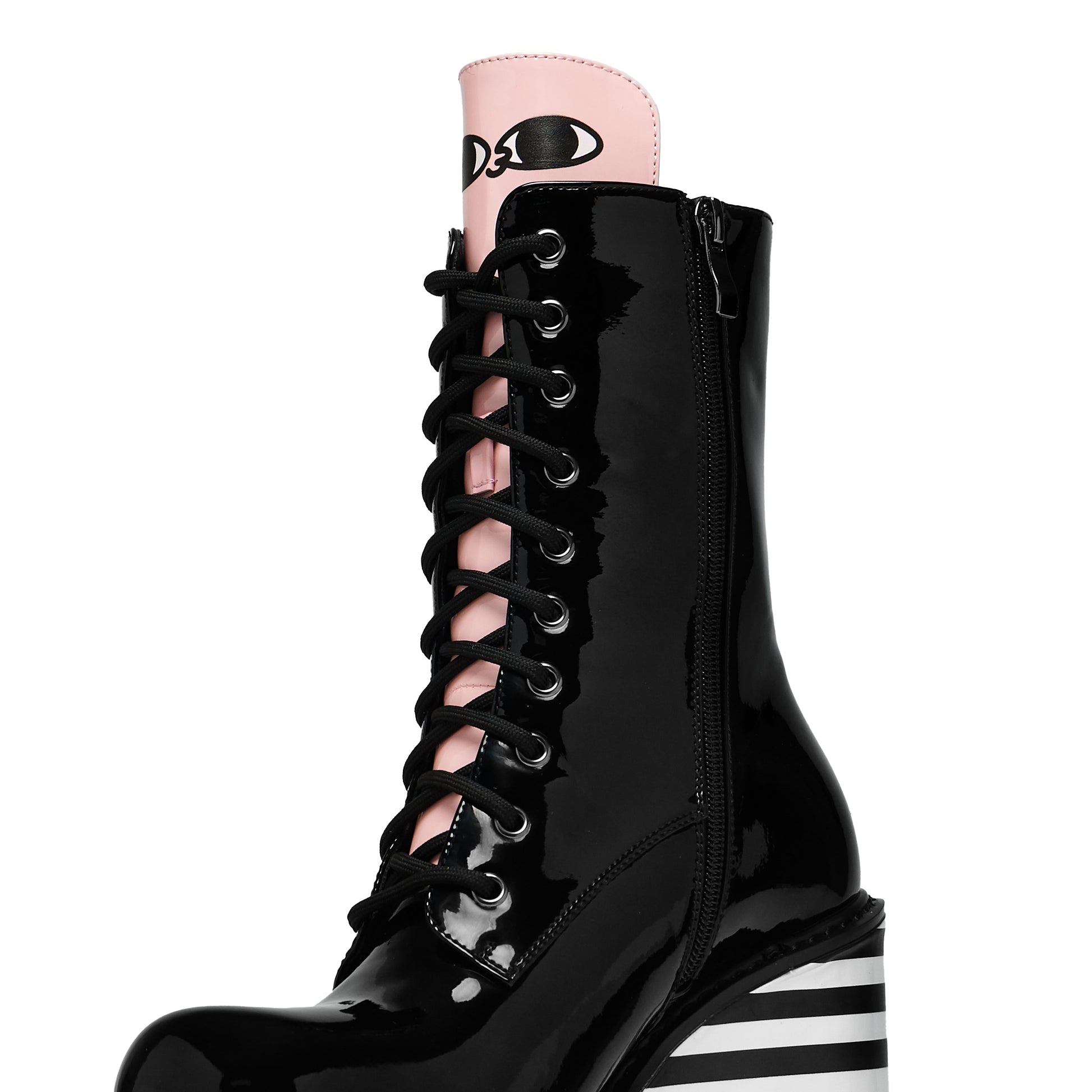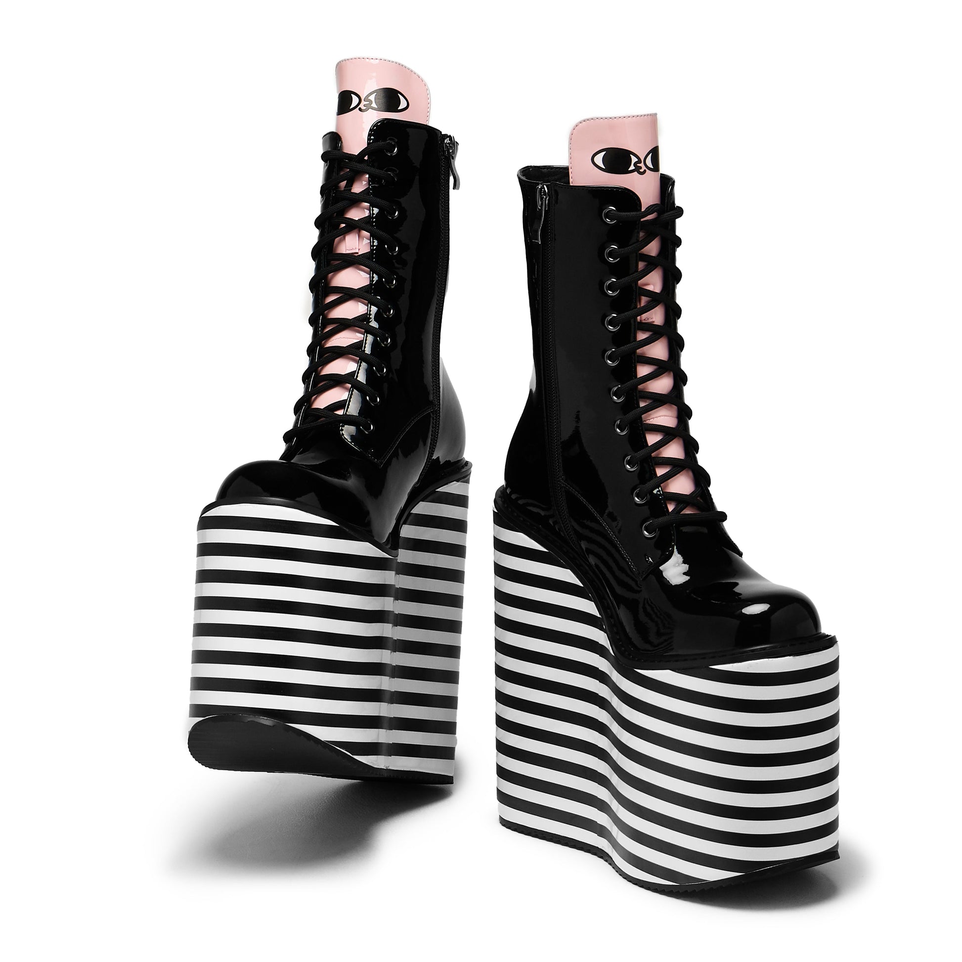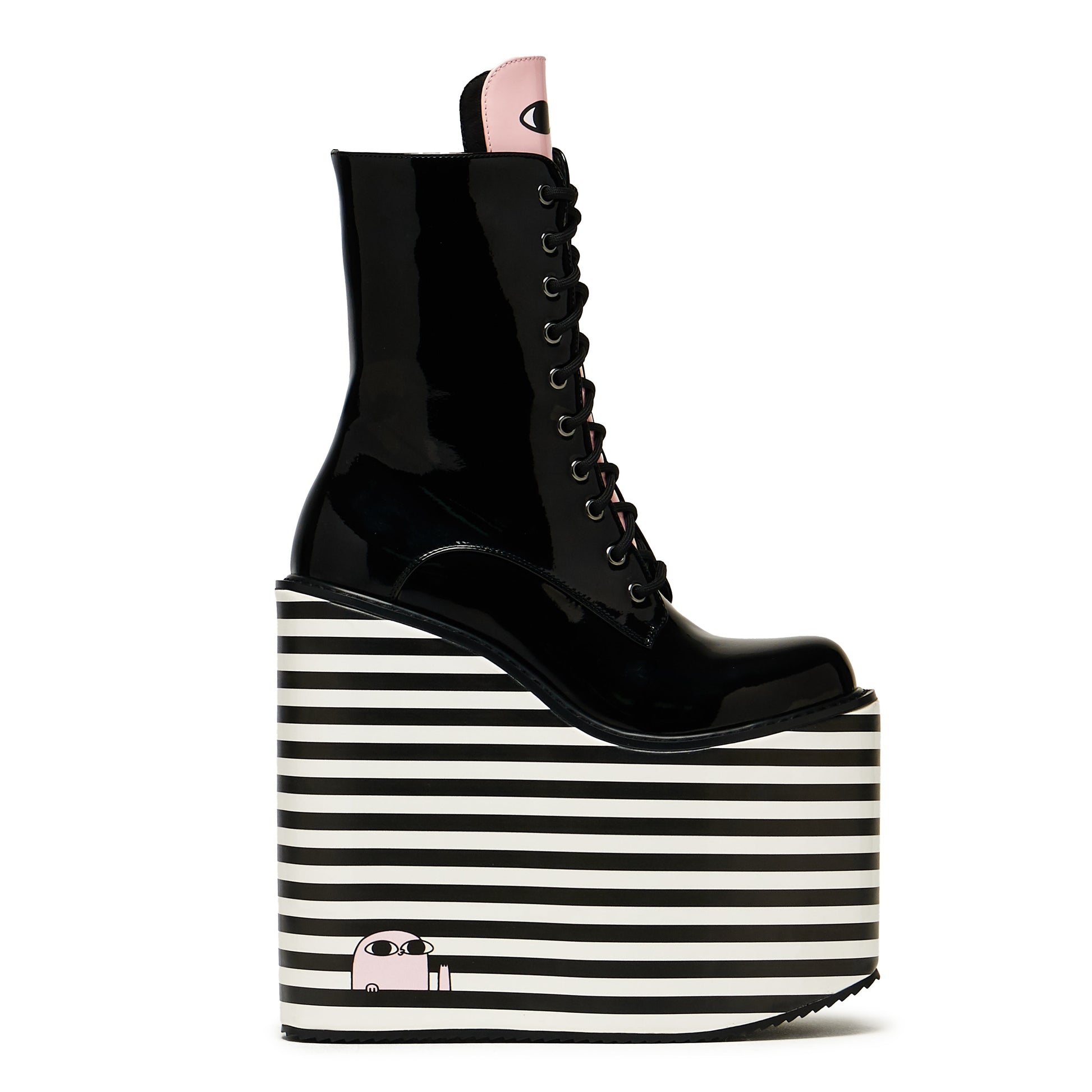 Go big, go bold, go full Bean. These are towering, trippy, and totally unapologetic. Designed with cartoon mischief in mind, this super stacked striped platform features a surprise Bean peeking out from the bottom corner of outsole and a cheeky tongue panel with his face popping up top—he’s along for the ride with you. Glossy black patent uppers add a sleek, high-shine finish while the hypnotic monochrome stripes make every step feel like a walk through a comic dreamscape. Cute, weird, and wonderfully loud.