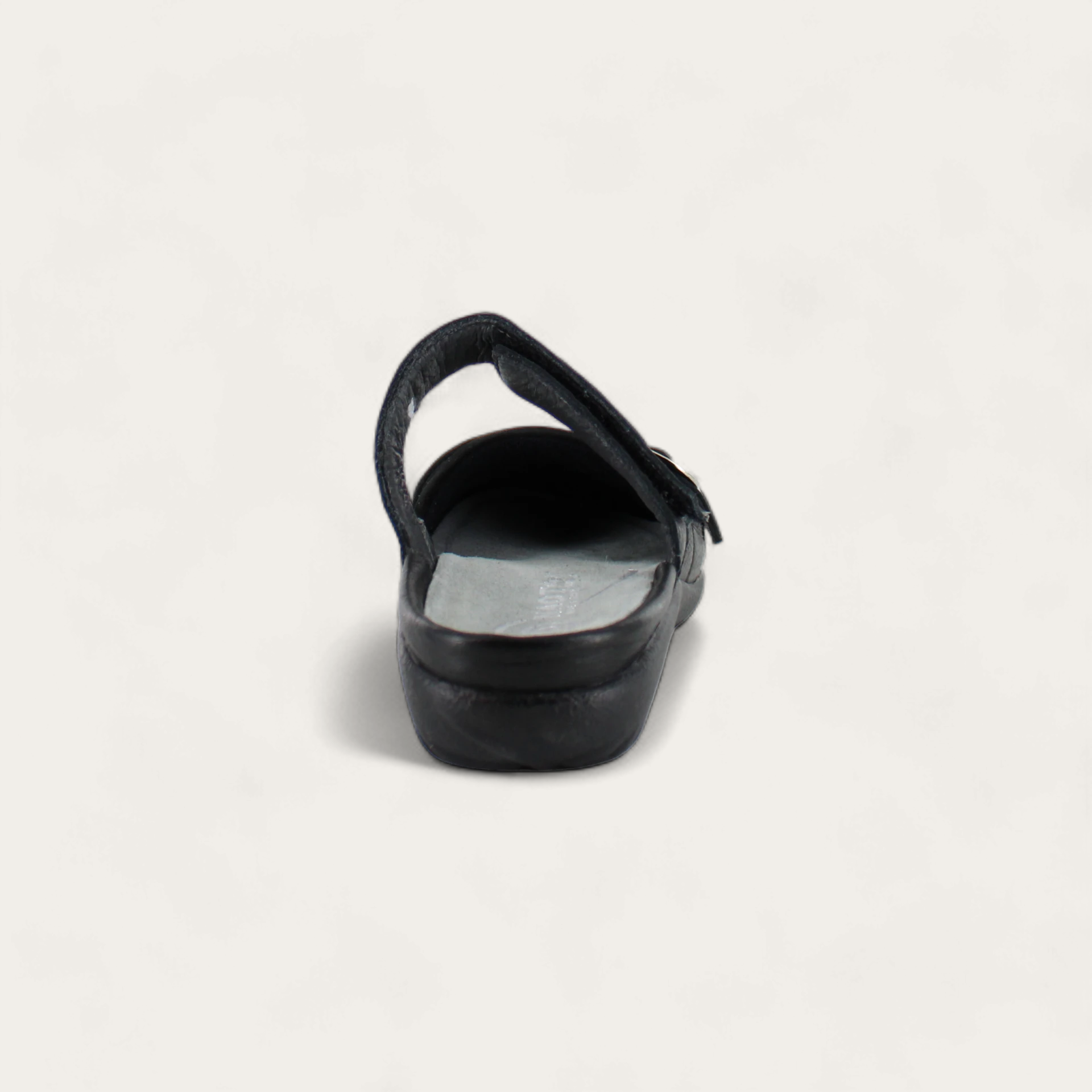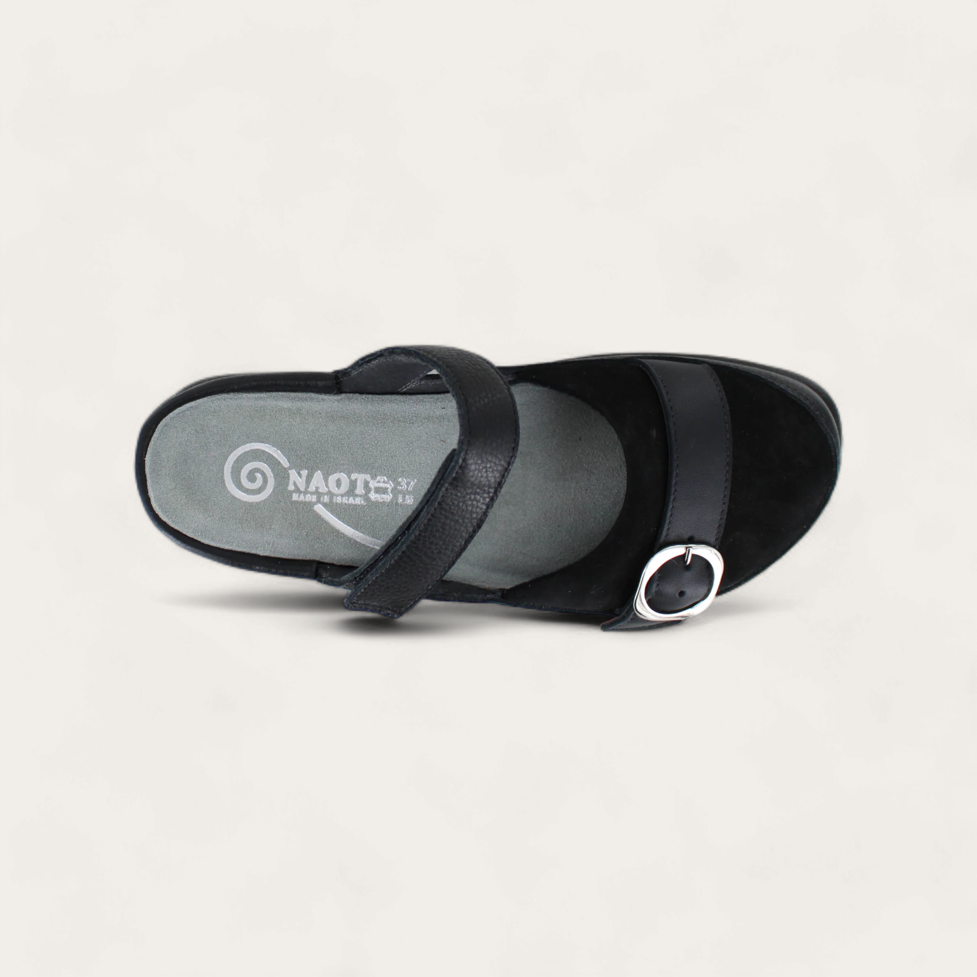 Naot Hongi is a fashionable maryjane inspired mule, accented with a chic silver toned faux buckle. The front portion of the Hongi features padded technical lining which provides comfort and absorbs moisture. Naot's removable, anatomic cork and latex footbed is wrapped in pampering suede and molds to the shape of the foot with wear. The Koru Collection features a 1 polyurethane sole which is extremely lightweight, durable and slip resistant. This collection uses a hand-sewn Strobel construction making it strong and extremely flexible. American Podiatric Medical Association (APMA) Accepted for promoting good foot health.