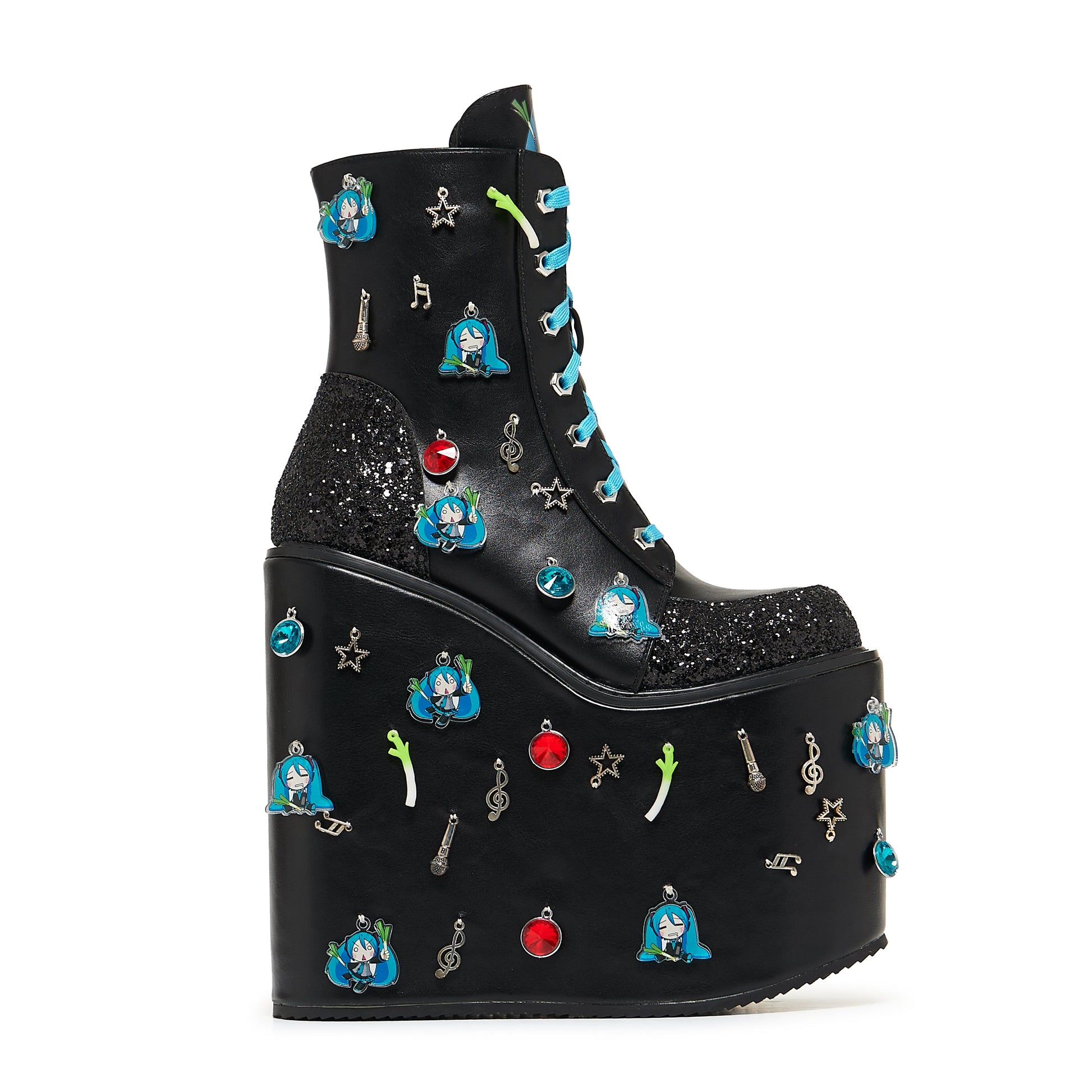 Thirteen centimetres of stage level altitude, wired with every in‑joke the fandom loves. The Musical Leek mega boot turns our tallest silhouette into a walking remix, stitched‑on pixel Miku sprites, music notes, star bolts and of course the legendary leek (iykyk)