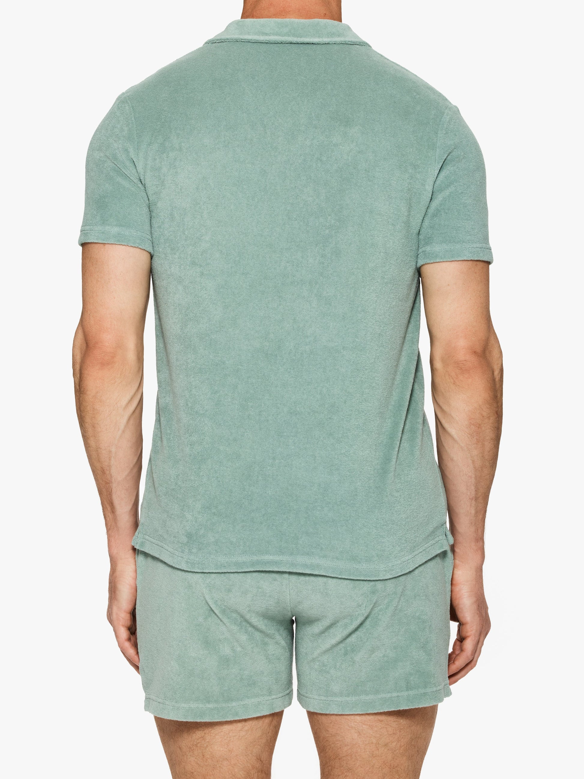 The new RD tennis polo has been designed in a lightweight, ultra-soft terry fabric made from organic cotton and recycled polyester. Terry is ideal for the beach and brings a retro touch. No zip or buttons, simply an open V-neck for a relaxed, retro look. Featuring the two discrete black-lacquered RON DORFF eyelets on the side.