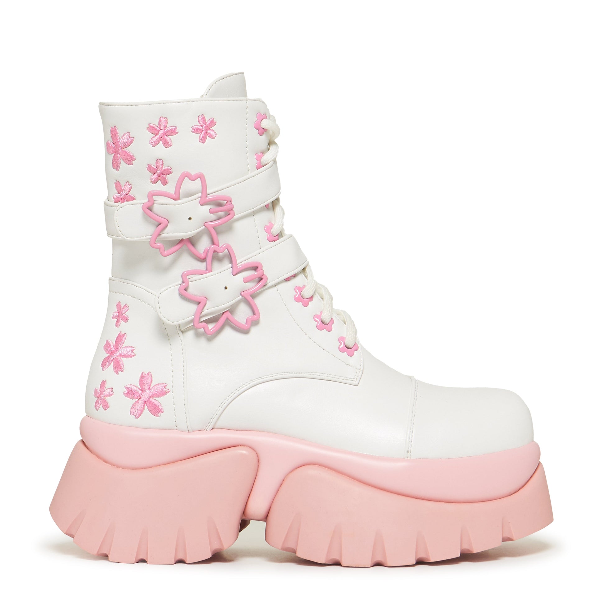 The soft, white faux leather upper is sprinkled with Sakura Miku accurate cherry blossom embroidery and threaded with custom flower shaped eyelets. Two oversized sakura petal buckles complete the boots, while a subtle Sakura Miku logo moves to the tongue, keeping the tribute centre stage without overpowering the silhouette.