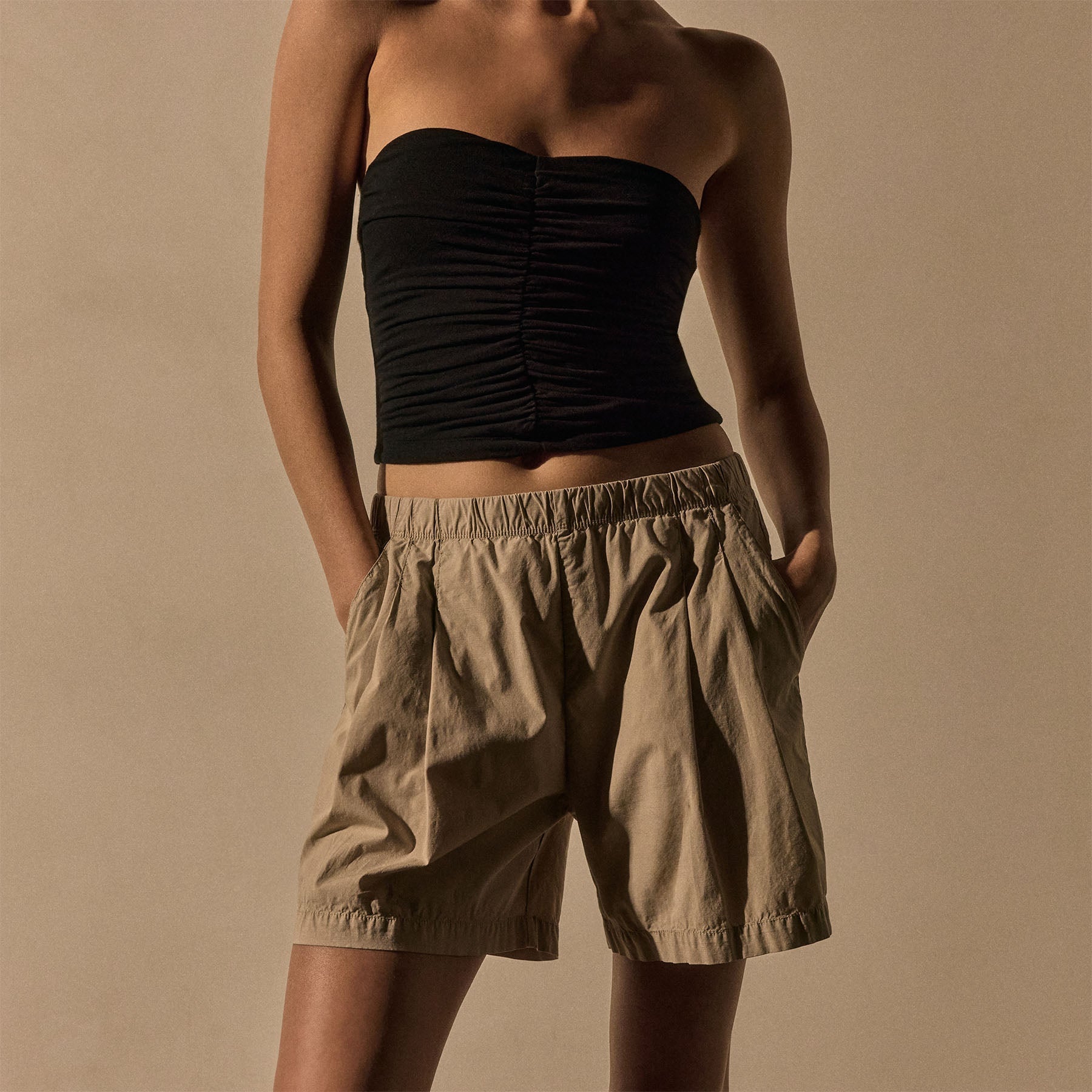 Italian linen stretch poplin. Pleats in the front. Elasticized waistband and a clean finish hem. Front slash pockets.