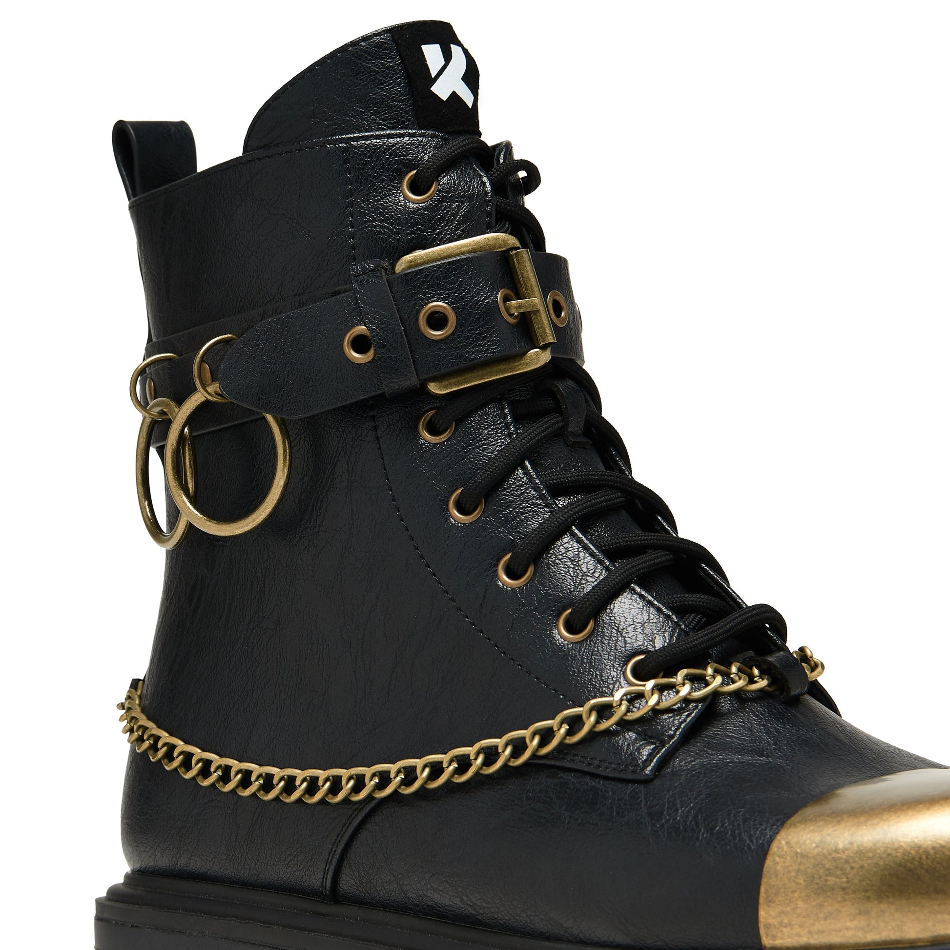 You’ve got double ring hardware at the ankle, matte gold eyelets, and metal plate detailing built into the sole. There’s a balance here: heavy styling with clean execution. Texture without chaos.