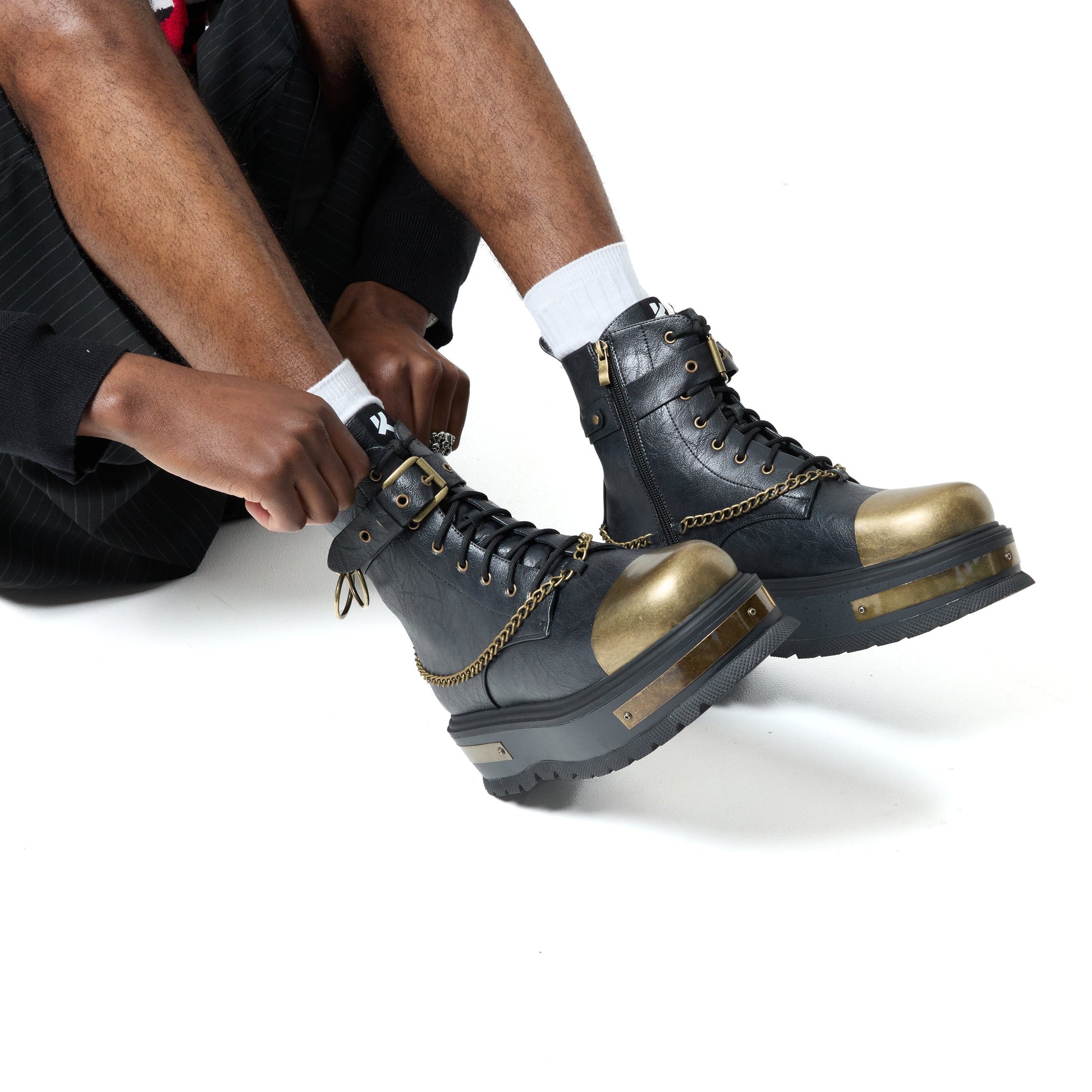 We don’t add gold to shine — we add it to anchor. The brushed toe cap isn’t polished for perfection, it’s there to take the hit. Marks, knocks, dents — that’s all part of the story. The chain detail isn’t delicate either. It wraps the upper like it belongs there. Weighted. Intentional.