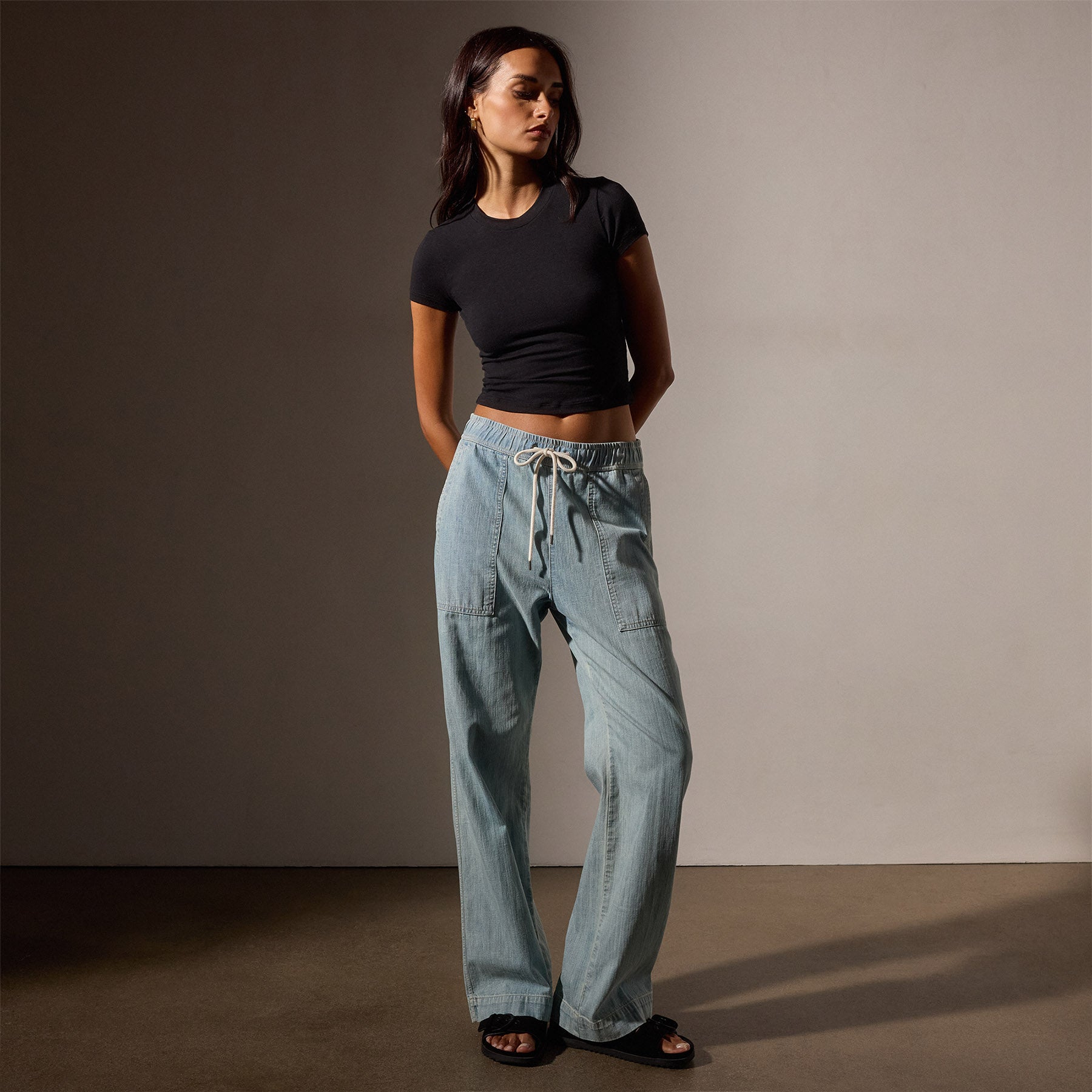Our Wide Leg Pull-On Denim Pant has a slim fit through the hip to a wide leg hem. This Italian denim pant features patch pockets, contrast stitching, and a elastic waistband with drawcord for effortless style and comfort.